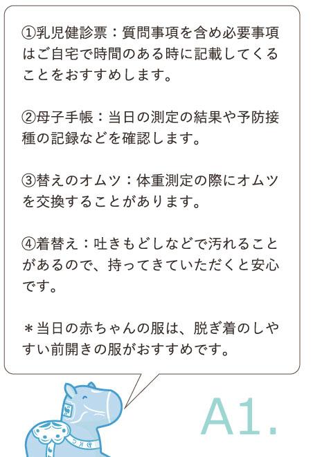 母子手帳、乳幼児健康診査受診表(各月齢用)を必ずお持ちください。